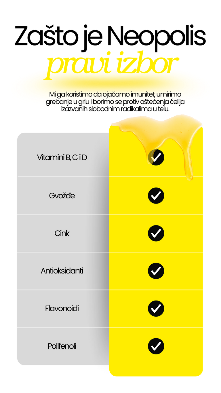 NeoPolis je pažljivo napravljen u Srbiji od čistih, prirodnih sastojaka. Bez rafinisanog šećera, GMO-a, glifosata, veštačkih aroma, boja i antibiotika – potpuno prirodan i bez lekova, jer vaše zdravlje zaslužuje iskrenost i moć prirode.