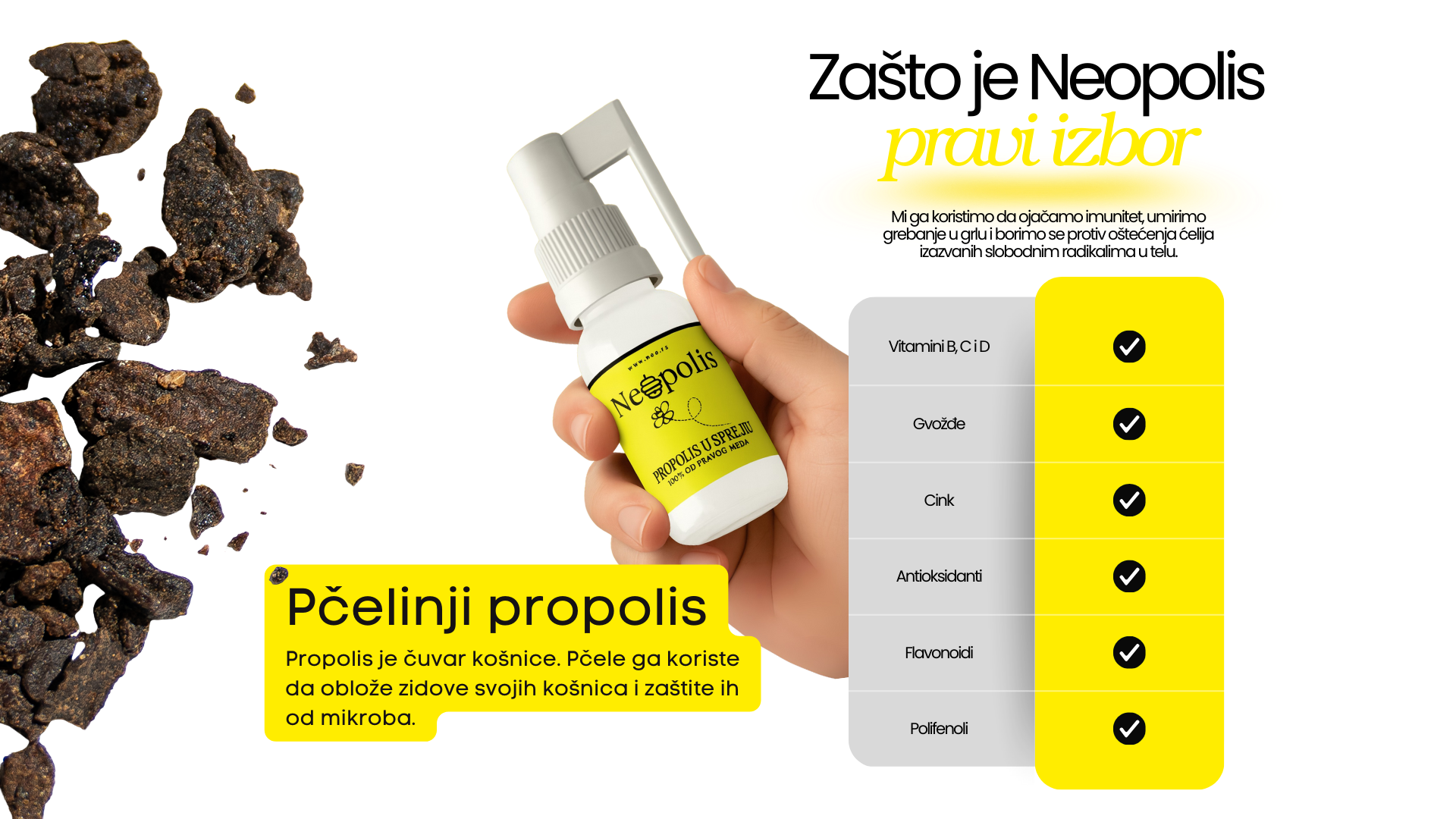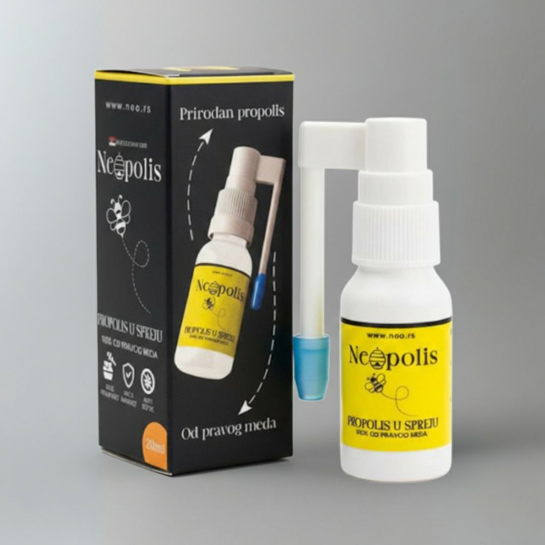 Za razliku od prosečnih apotekarskih sprejeva koji sadrže oko 1,2 mg propolisa po prskanju, NeoPolis donosi čak 12 mg po spreju – deset puta više! Zato je prirodniji, delotvorniji i proizveden u Srbiji.